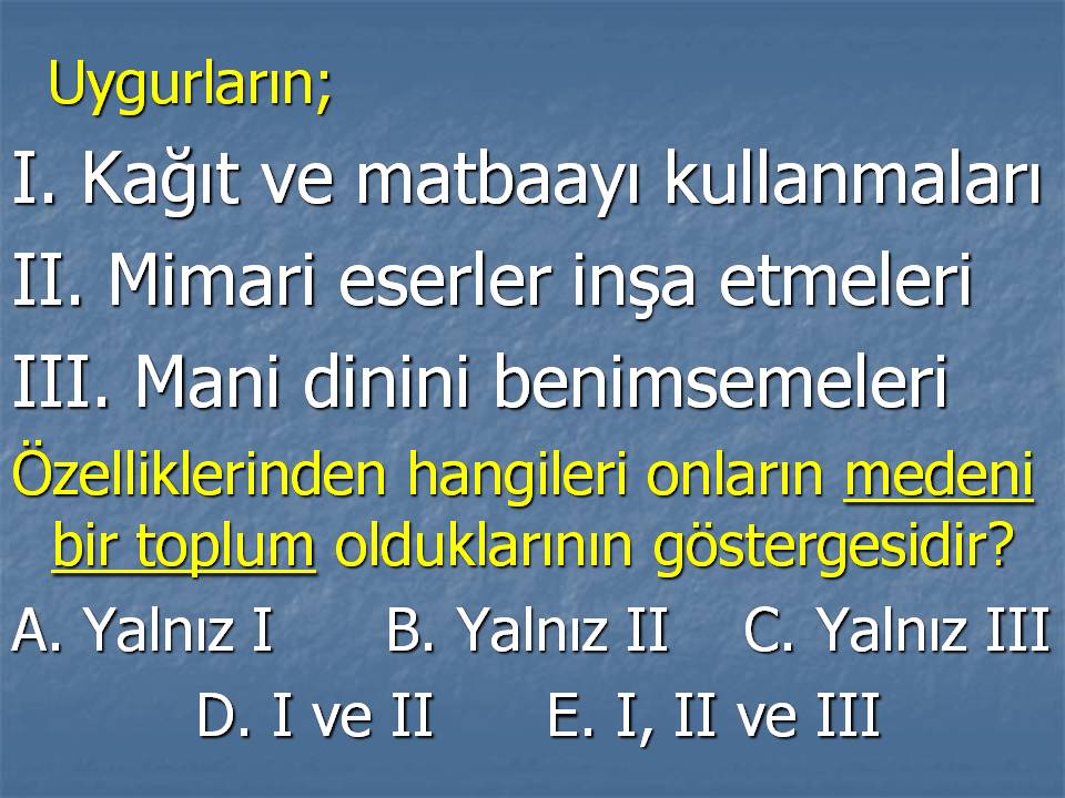 2013 - 2014 Eğitim Öğretim Yılı "Türk Tarihi" sunumunun Uygurlar İle İlgili Test Sorusu adlı slayt 2012-11-28 tarihinde sitemize eklendi ve "Uygurlar İle İlgili Test Sorusu" slaytı 2955 defa incelendi. "Türk Tarihi" sunumunda toplam 63 slayt bulunmaktadır.
